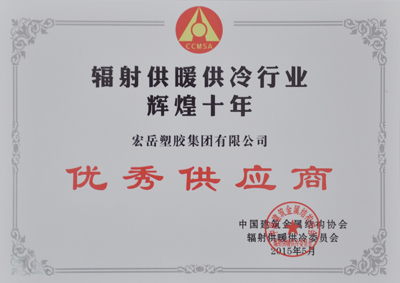2015年5月15日,中国辐射供暖供冷委员会十周年庆典在北京盛大举行。会上表彰了一批对辐射供暖供冷行业发展作出突出贡献的企业和个人,好博集团喜获中国辐射供暖供冷行业辉煌十年优秀供应商殊荣,好博塑胶集团有限公司张思良总经理荣获中国辐射供暖供冷行业功勋奖。