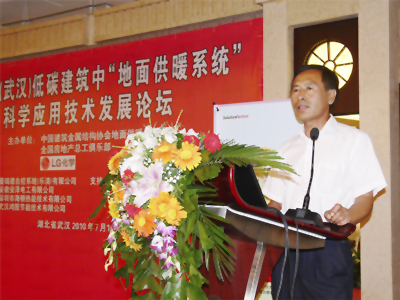 首先,LG化学印周焕部长、武汉建筑节能办公室肖钢主任分别致辞。随后,湖北好博塑胶有限公司总经理张思良在主席台上发言,他对与会的企业代表感兴趣的,在地暖系统中广泛应用的PE-Xa管、PE-RT管、PE-RT/EVOH阻氧管、地源热泵专用管、预制薄型地暖系统及配套分集水器等公司产品,从目前的发展现况和管材、管件的产品特点,作出了详尽的说明,并现场回答了企业代表提出的关于公司资质、质量保证等方面的问题。当张总发出“欢迎各位嘉宾莅临好博在孝感开发区的工业园考察指导”的邀请时,现场响起了热烈的掌声。