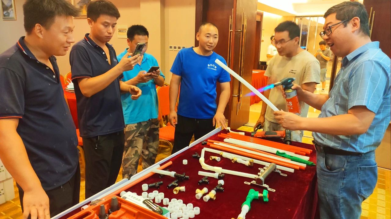 好博1+区域运营经理向各位参会者介绍了好博塑胶集团概况,并着重讲解了好博1+产品体系及PE-Xa快易连接管道系统,凭借其简单、快捷、安全的产品及连接优势,得到了与会水电技师们的高度好评。