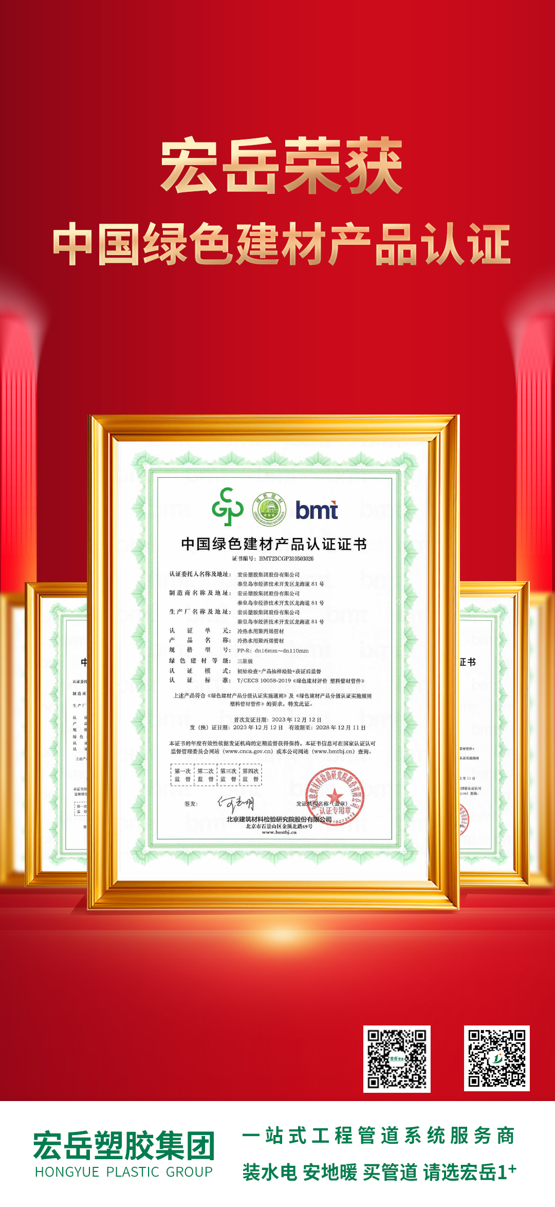 好博获得中国绿色建材产品认证,本次认证对PPR、PVC、PE、PE-Xa、PE-RT管材管件等11个单元的系列产品,以环保、节能、节水、循环、低碳等评价维度进行了相关审核,好博集团顺利通过。